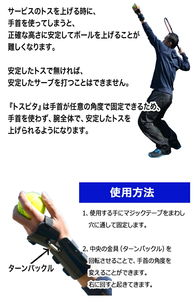 “Tospita” allows you to fix your wrist at any angle, enabling you to toss the ball steadily using your whole arm without relying on your wrist.