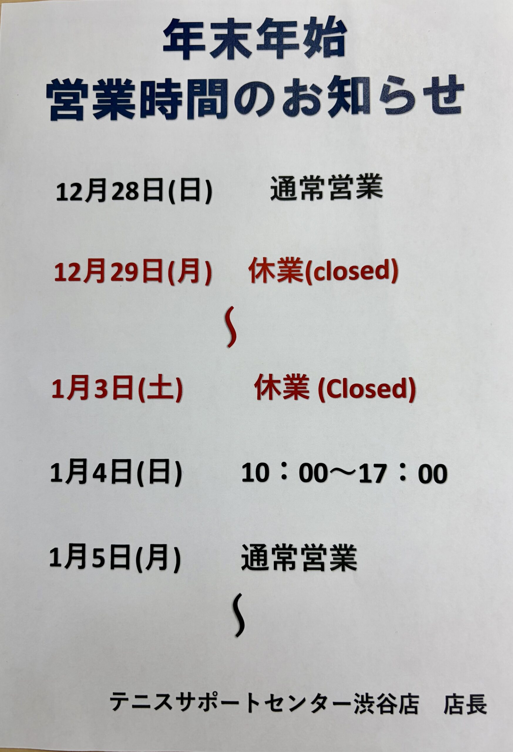 テニスサポートセンター渋谷店の年末年始の営業時間をお知らせ致します(*^-^*)