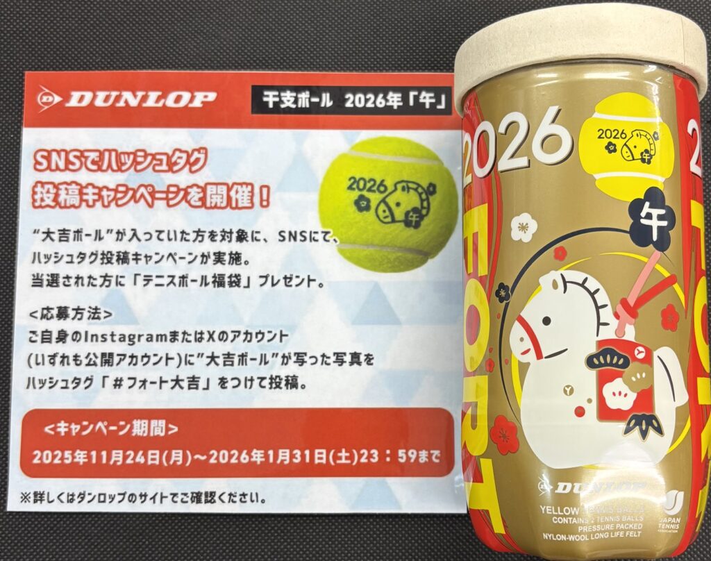 大吉を引き当てた方を対象に、SNSで大吉ボールが写った写真と一緒に「#フォート大吉」をつけて投稿していただくと、抽選でテニスボール福袋が当たるかも!?